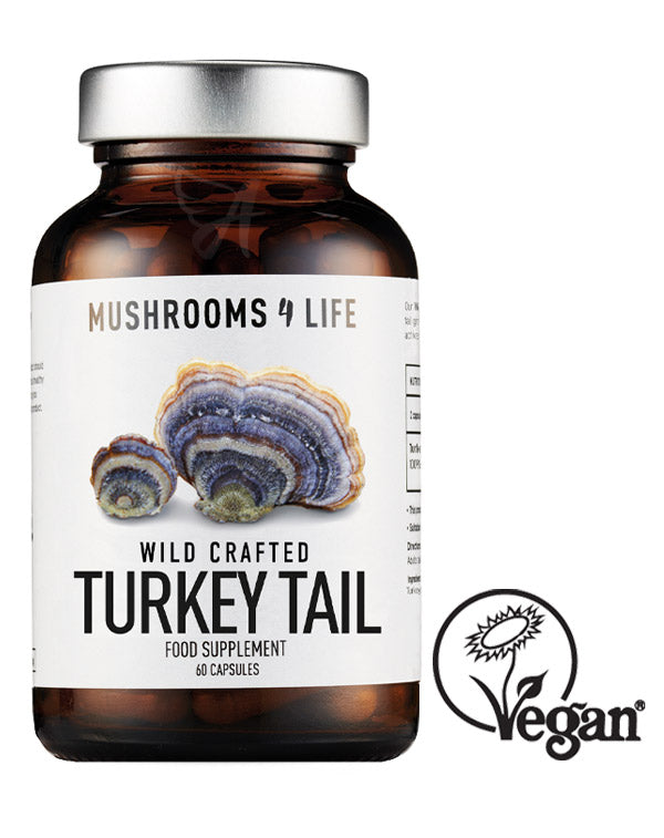 60 x wild-harvested Turkey Tail mushroom capsules. Each capsule contains 400mg of Turkey Tail mushroom powder with no added fillers, binders or preservatives. Manufactured in the UK, tested for toxins.